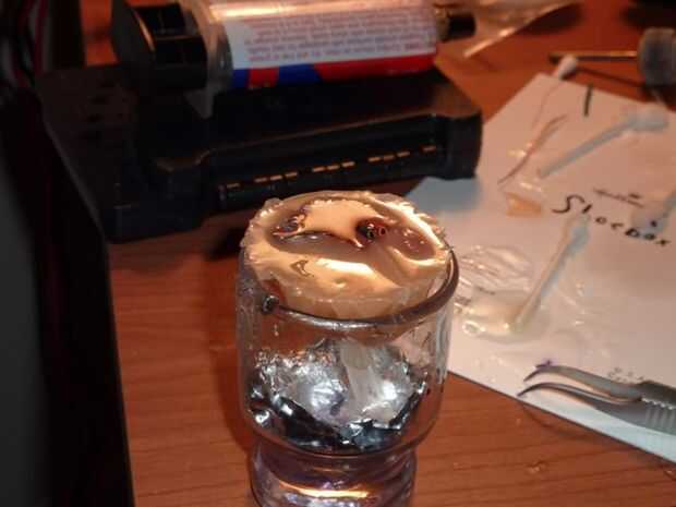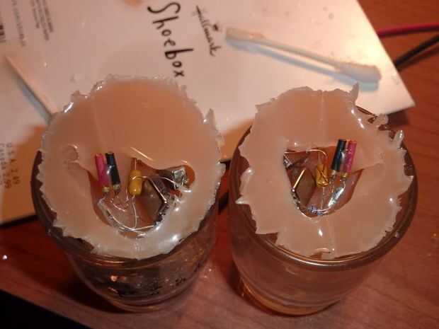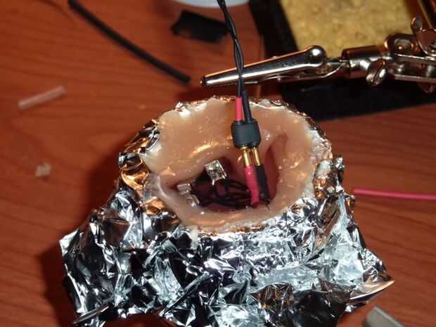En primer lugar, con pegamento (usé un epoxy) adjuntar (y sellará completamente) una longitud de tubo acústico para el conductor (aproximadamente dos pulgadas; Asegúrese de que su pegamento no consigue realmente en la tubería, por encima de la salida del controlador). En última instancia, quiere woofer para tener la mayor longitud de la tubería y el tweeter a más corto, pero no te preocupes esto ahora mismo. Sólo dése extra para jugar más tarde. Que puede estallar en los amortiguadores acústicos si quieres (verde en el altavoz para bajas audiofrecuencias, amarillos en el medio y tweeter) o esperar hasta más tarde. A continuación, soldadura conduce a todos sus conductores. En algunas de mis fotos verás que al principio que fui al problema de la aislamiento de todas las conexiones a cada conductor, sólo para descubrir veladamente, por algún motivo desconocido para mí, no importa. Así que lo que más tarde hice fue usar el condensador como una ventaja para el tweeter, un resistor como un líder para el woofer, y para todos los otros conductores apenas un solo filamento de alambre de cobre (se puede de ver esto en la primera foto). Creo que quieres las tapas y las resistencias a ser utilizado como ánodos, que es lo que hice, pero yo no soy un ingeniero eléctrico, así que si alguien sabe más sobre esto por favor me corrijan. A continuación, se unen todos sus ánodos de soldadura en uno de los conectores hembra y luego hacer lo mismo para los cátodos. Tienes la opción de omitir los conectores y a soldar el cable de conexión directamente a los cables (no sé por qué, por IEMs siempre tienen conectores, por lo que siguieron el juego). Después de que los cables se sueldan a los conectores se debe "sellar" los conectores con la tubería del encogimiento (conectores hembra son huecos, y cuando viertes la resina sobre el funcionamiento interno se llenan si no están selladas). Una vez más, ignorando que mi conectores están aislados en algunas de las fotos, usted debe terminar con algo que parece cuadro 3. Si usted ha hecho su propio cable de conexión, debe ser todo. Si ha recuperado las piezas aprovechables uno o compra un cable de Westone, tendrás que hacer el conector macho corresponde a los conectores hembra en el IEMs, así que la soldadura de los conectores macho en los extremos de los cables y forme algún tipo de terminación. A continuación, prueba de EM hacia fuera. Enchufe los conectores de su cable de conexión y sube tu iPod. Prueba de que cada conductor trabaja mediante el bloqueo de los tubos de los otros dos. Si quieres probarlos realmente en los oídos puede tomar algunos tapones para los oídos de espuma, filete, introducir los tubos y después inserte con cuidado el tapón en el oído. Tenga en cuenta el bajo no puede ser que impresionante si no obtiene un buen sellado. Una vez que estés feliz que todo es trabajar, usted necesitará encajan las partes internas de los moldes. Antes de hacer esto, usted tendrá que hacer un agujero en el fondo de cada molde, en la punta del "conducto auditivo" de los tubos a, a la de la foto 5. Las dos formas más sencillas de hacer esto son 1) volver atrás en el tiempo y su impresión en el vaso de chupito con el extremo del conducto auditivo justo al lado el borde del vidrio por lo que fácilmente ha localizado, o 2) tomar un pan cuchillo y cortar la parte inferior del molde que usted apenas para exponer el extremo del canal (elegí la opción 1 menos el viaje en el tiempo). Una vez que el agujero puede la tubería a través de la alimentación y luego situar su funcionamiento interno, teniendo en cuenta que la acústica de la tubería de lo woofer para ser el más largo (aproximadamente dos pulgadas de donde será la apertura en la punta de la saliente en el canal auditivo a donde el conductor se sienta en el auricular), seguido por el rango medio (aproximadamente una pulgada) , con el tubo para el tweeter que la más corta (aproximadamente la mitad de una pulgada). Ahora, del tirón sus moldes al revés (como la foto 5) y sello alrededor de la tubería (los espacios entre la tubería y el molde) con algunos epoxy. IT debe ser sellado o se derramará cuando vierta la resina en los moldes.