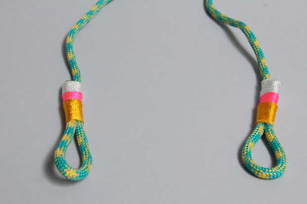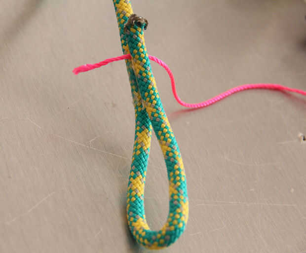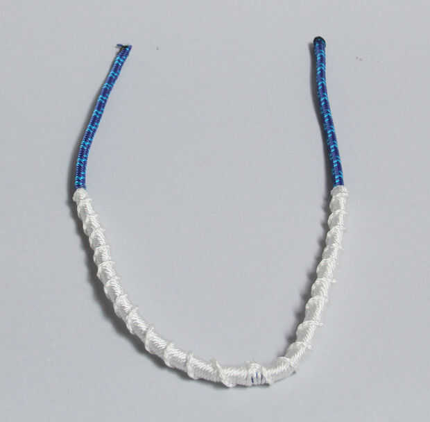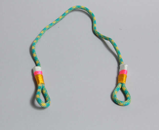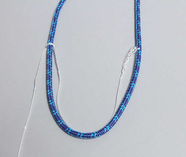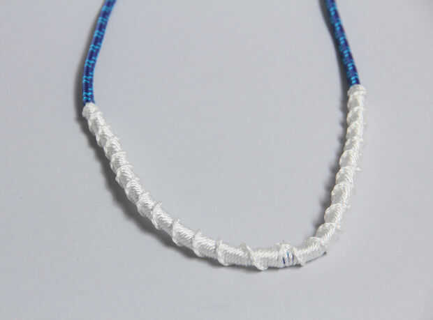 Una de las características definitorias de los collares de Proenza Schouler es la cadena espiral alrededor de la cuerda de escalada. Esto es realmente fácil de hacer. Sólo continuamente atar nudos con la línea de masón alrededor de la cuerda y la espiral se forma naturalmente.