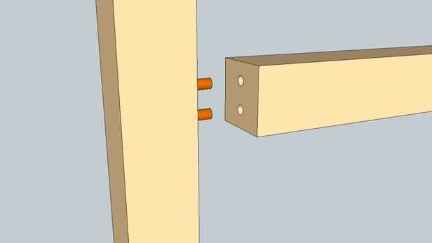 Las vigas están pegadas a los postes con espigas de madera. Esto le da una conexión muy fuerte que es casi tan fuerte como la verdadera mortaja y espiga común. La chalange con este tipo de conexiones es perforar dos agujeros para cada conexión que deben coincidir exáctamente.