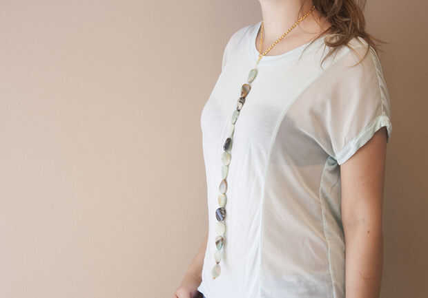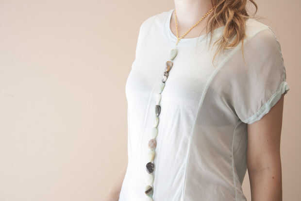Paso 4: Colocar un broche en su cadena de apertura de un anillo del salto, bucle a través de la hebilla y la cadena y después cierre el anillo del salto. Luego fije el centro de la cadena al anillo del salto en la cadena de cuentas.