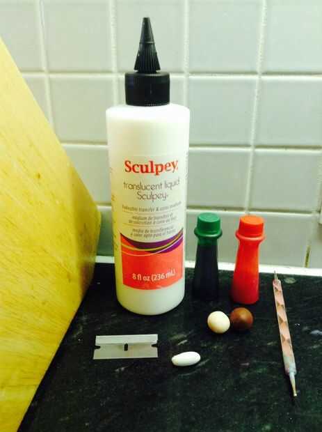 • Sculpey líquido translúcido (TLS) • Rojo y colorante verde • Arcilla beige, marrón y blanca • Cuchillo del Exacto o navaja normal • El horno • Herramienta de punteado • palillo