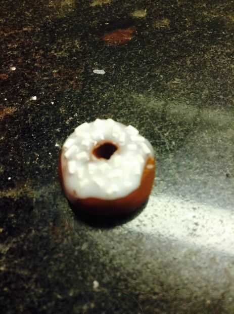 Estirar una pieza delgada de arcilla blanca y utilizar su cuchillo para cortar en pedazos como espolvorear. Aplicar sobre el donut con un palillo hasta que tenga el aspecto deseado.