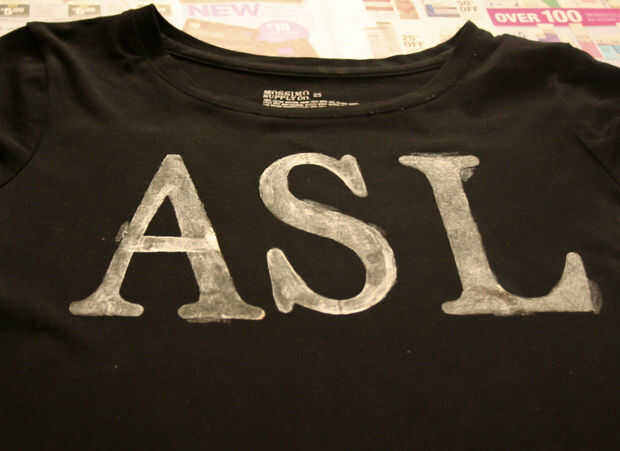 Ahora, llenar su paleta con algunos colores de pintura de tela y utilizar a un pouncer esponja en esponja en sus iniciales en su camiseta. Mi camisa es negra, así que estoy utilizando una pintura de tela blanca. Puede hacer el color como negrita o como luz como quieras. Más colores de la pintura salen dependiendo del color de la tela de la camiseta.