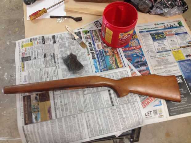 Me pidieron que repintado un stock de armas para ser utilizado como un regalo. El acabado estaba desgastado y sin brillo con arañazos. Aceite para armas había manchado la madera oscura en lugares. Necesitaba un buen acabado. Él quería un acabado lustre agradable sobre el stock.