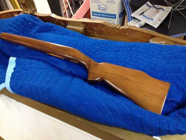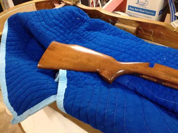 Momento de aplicar el acabado. Trabajando desde el tope de la culata de la pistola hasta, cubrió la madera con acabado Rustoleum claro. Si es posible, siempre cepille con el grano. El acabado se seca rápidamente como la mancha. Después de aproximadamente una hora, enarenó ligeramente la culata con una lija de 1200 para extraer las partículas de polvo. Me lo dio una vez otra vez con un trapo de polvo fresco y aplicar otra capa. Y otra vez. Tres son lo generalmente se aplican pero quería extra brillante así que añadido un cuarto. Estoy bastante contento con los resultados.