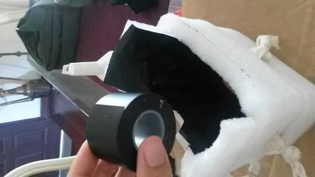 Después de que el titular del celular fue hecho dije grabar el interior de las gafas con cinta aislante negra, por dos razones principalmente: uno, la espuma es blanca y la luz pasa a través de él y eso es un big no no; Dos, esta configuración es muy frágil, por lo que la cinta hace más durable; Y realmente hay una tercera razón, primero quería usar pintura negra, pero tuve que comprarlo y la cinta ya fue comprada así que... ahorro $;