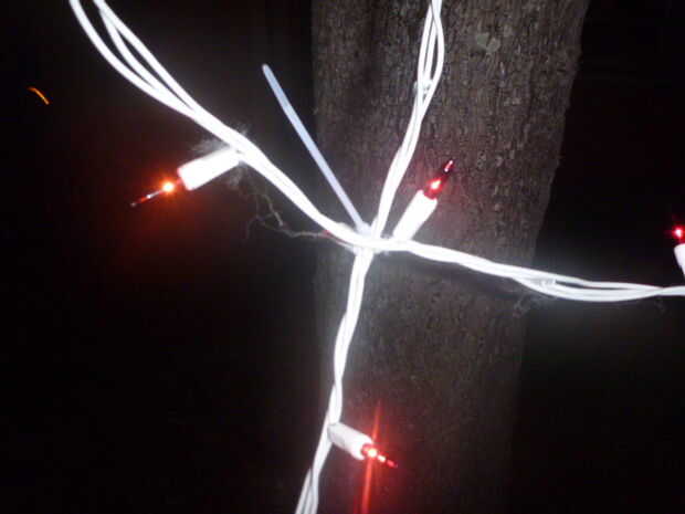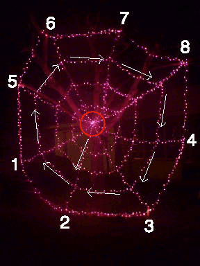 Una vez que haya creado todos los rayos de tu web, es el momento de crear el interior de las correas.  Empiece en el centro otra vez y a la salida cada uno habló como en la ilustración de la imagen. Utilice sujetacables en cada intersección donde se cruzan las luces para mantener los radios y las correas juntos.  Hacer este proceso 2 veces más para crear el resto de la cinta.  Usted puede decidir cómo muchos usted quieren, sólo tener en cuenta que tarda un montón de luces para conseguir realmente detallada.  Sólo hacemos generalmente 4 rondas, incluyendo el perímetro inicial ronda.  Desde lejos, se ve mucho mejor que sean espaciadas.  Si están demasiado juntos, sólo parece un montón de luces en lugar de una tela de araña.  Continúe alrededor y alrededor de cremallera fleje las luces en cada intersección.  Probar a tantas luces desde el enchufe de la parte posterior de centro como sea posible en lugar de respaldo alcancía.