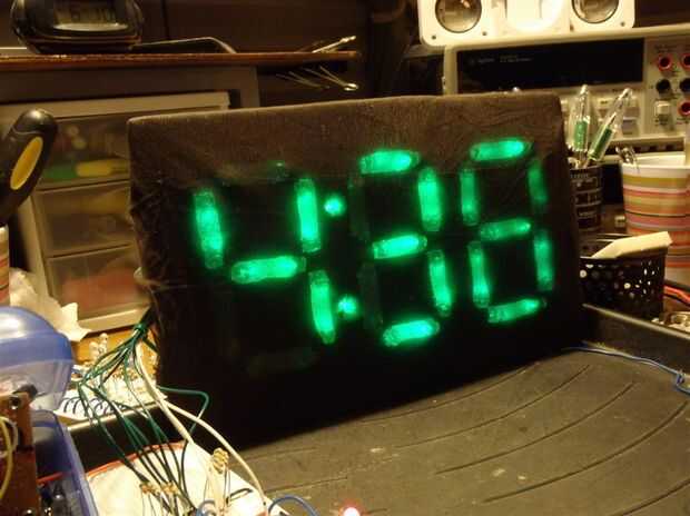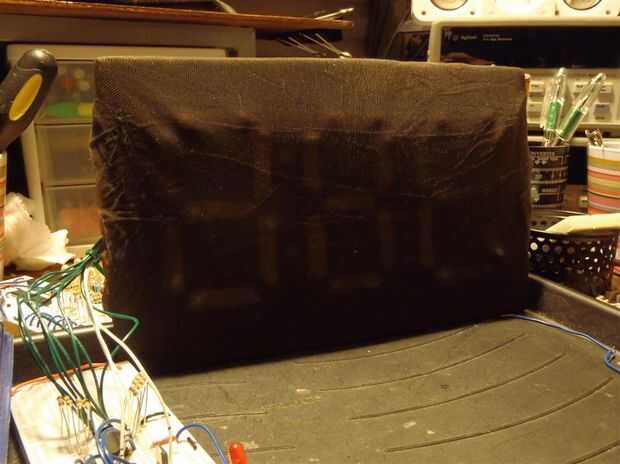 Si son compras poca corriente a través de sus LEDs pero la pantalla debe ser utilizado en luz brillante, puede ser difícil distinguir los segmentos encendidos de los apagados porque la luz ambiente se disipará en los segmentos de apagado. Para resolver este problema, un simple filtro puede ser colocado sobre la pantalla. Mi primer pensamiento fue utilizar una hoja de malla de alambre, pero esto no funcionó como esperaba. Terminé usando un barato par de medias negras para servir a este propósito. Agregar este material sobre la pantalla hará que los segmentos apagados mucho menos notable mientras sigue permitiendo los segmentos iluminados a brillar a través.