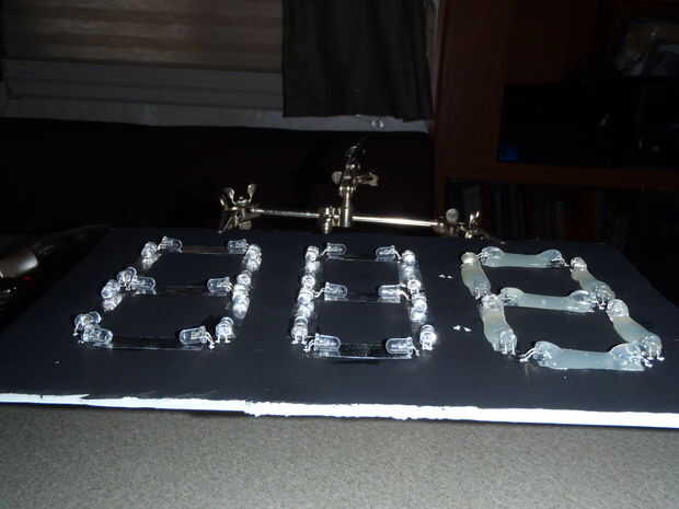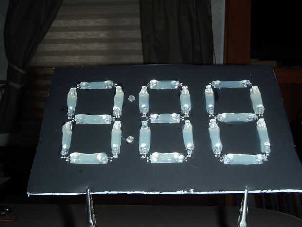 Mi pantalla se utilizará como un temporizador, que necesitaba dos puntos para separar los minutos y segundos. Para crear los dos puntos, hacer un agujero más grande y empuje el LED todo a través de él en lugar de tener el sit LED encima de la espuma con sólo los cables a través. Esto impide que los dos puntos de pie más alto de la espuma que el resto de la pantalla y también permite un poco de pegamento caliente para colocar sobre cada punto para disipar así.