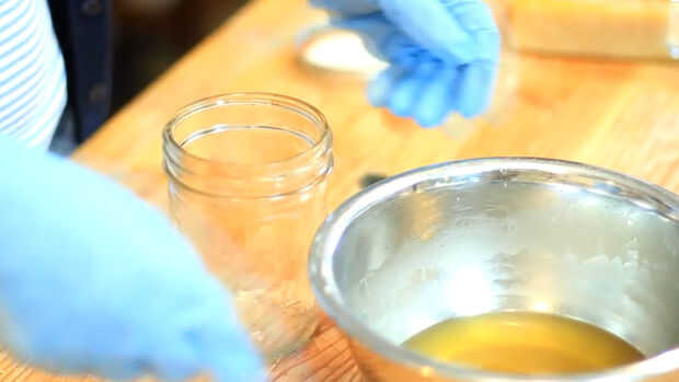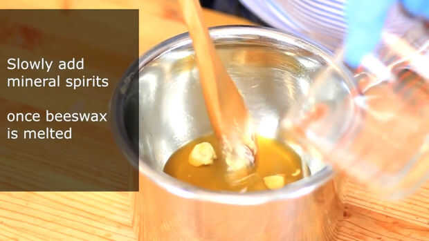 Una vez que el agua comience a hervir, poner la cera en el recipiente de acero inoxidable en la parte superior del bote. Derrite lentamente la cera hasta que se disuelva. En ese momento, agregar aguarrás en partes iguales y combinar lentamente sobre baño María. Verter en un tarro de masón, una lata de metal u otra cosa que almacenar.