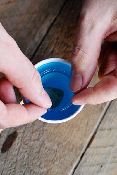 Coloque la taza más pequeña dentro de la taza y empújela hacia abajo hasta que quede a nivel con el borde de la taza más grande. Añadir una piedra para ayudar a sopesar hacia abajo.