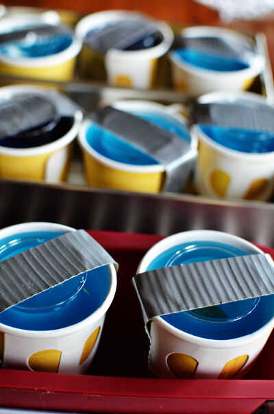Repita hasta que han deseado número de vasos de chupito. Colocar dentro del congelador durante 6-8 horas. (Puse las tazas llenas dentro de un molde antes de colocar dentro del congelador, en caso de se desbordaban).