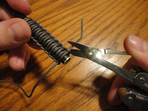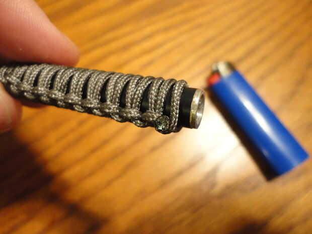 Una vez que exitosamente han atado todos los de su cuerda de utilidad sobre la herramienta de bolsillo bricolaje, utilice un encendedor para sellar los extremos de la cuerda de utilidad para evitar que se deshilache.