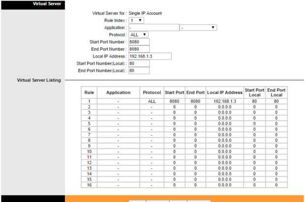 Noe introducir la IP pública y local en la página de configuración de servidor virtual. Aquí puede editar cualquiera de los puertos que enviado antes.
