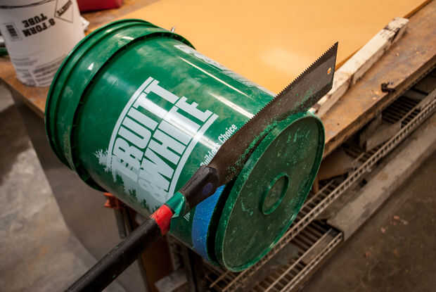 • Medir 1/2" por el lado de la parte inferior de la cubeta y envuelva la cinta alrededor del cubo para usar como una guía. Corte la parte inferior de la cubeta con una sierra de mano. El borde de la arena y limpiar virutas de plástico de la cubeta.