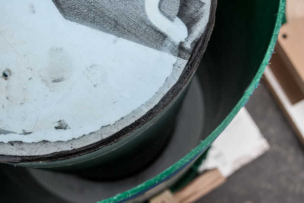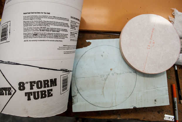 • Corte una sección larga de 13" de un tubo de forma concreta 8" de diámetro. Uno de los extremos se tapona con el 2" disco, el otro con un disco de 3/4" de madera contrachapada. Estos deben caber firmemente en el tubo.