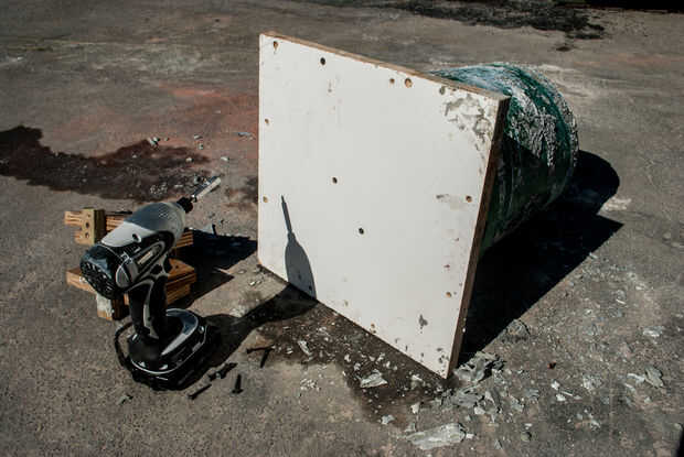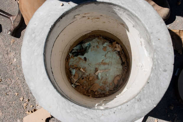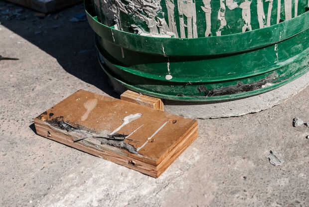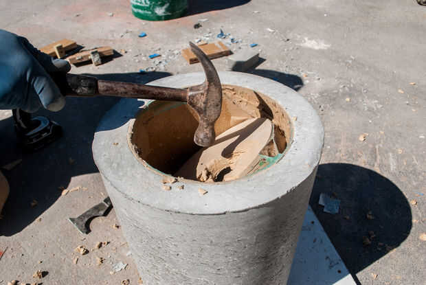 • Voltee el cubo y coloque el borde de la cubeta en un pedazo de madera para golpear flojo.