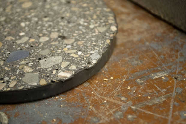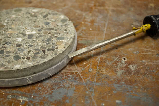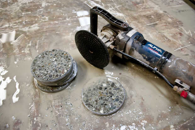 • Concreto es extremadamente difícil de moler sin el derecha herramientas de pulido del diamante. Incluso con un cojín de la mano de diamante grueso, tarda mucho tiempo para aplanar un disco de 4". Por esta razón es tan importante alisar la superficie trasera plana mientras que el concreto es todavía capaz de trabajo.