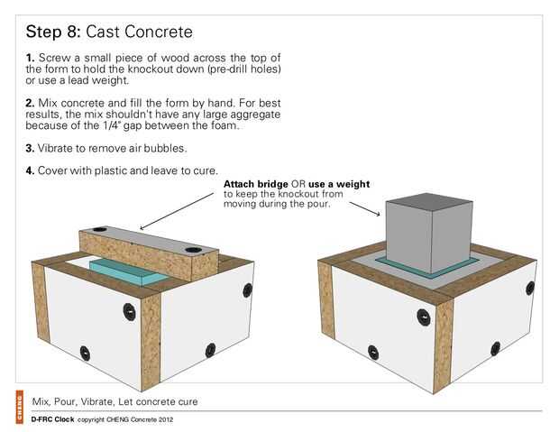 1. antes de mezclar y verter el hormigón, atornillar una madera contrachapada 'puente' en la parte superior del formulario. Esto mantendrá la eliminatoria abajo (la fuerza de empuje del hormigón líquido intentará flotar hacia arriba). Si se utiliza un puente, perfore en las paredes de forma de los tornillos o se puede deformar y split. Alternativamente usted puede utilizar un peso de plomo o algo pequeño y pesado. O bien, dejar espacio para verter el hormigón en la forma.