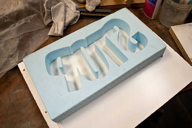 - Utilice las líneas de lápiz como guía y presione firmemente la espuma a la placa base. Para obtener la máxima hermeticidad, siga las instrucciones en el adhesivo en aerosol y rocíe un poco de espuma en la placa base también.