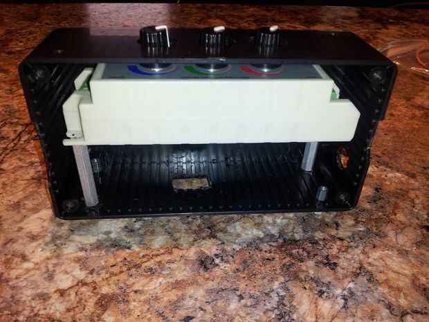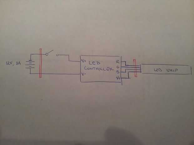 Empecé con la electrónica para tener una idea de lo que exactamente necesitaría caber en la caja. El dimmer LED hecho bastante fácil cableado. Toma 12V DC como entrada y las salidas son los canales R, G y B y de una línea de 12V. Decidí usar unos 4 pies de la tira LED. Basado en las especificaciones en la página web necesitaría unos 1.5A para alimentar las luces: