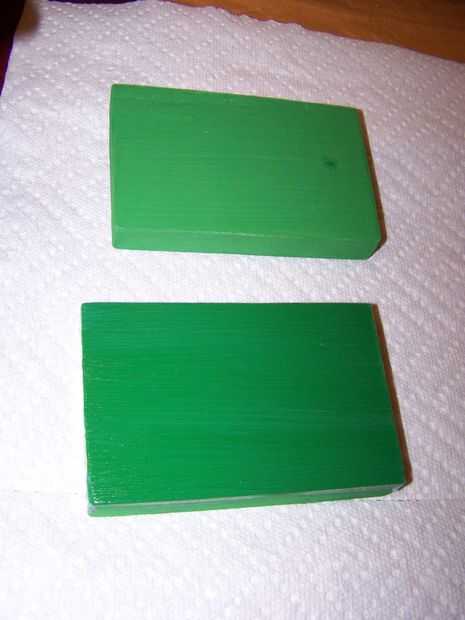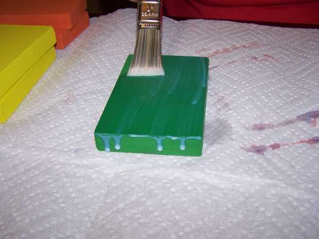 El barniz es bastante pegajoso, así que tenga cuidado al girar sobre el bloque. Usamos la toalla de papel debajo de cada bloque, pero en retrospectiva una pareja capas de periódico habría sido mejores.