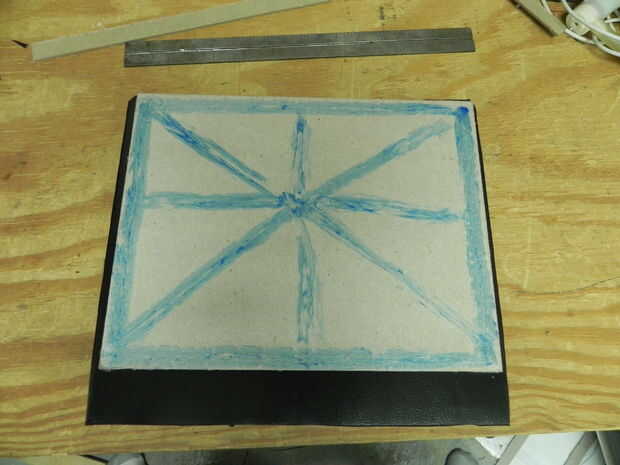 Mientras que el pegamento de la base es la creación, empezar a trabajar en la parte superior y lados de la caja. Empezar con la pieza de cierre. Perfore los agujeros espacian uniformemente para que los imanes en. Ver imagen de abajo para una ilustración. Este pice con maneras largas de cinta de vinilo de cinta alrededor de todo el camino. la siguiente cosa a hacer es laminado de la cubierta superior. Usando el palillo del pegamento, pegamento alrededor de los bordes de la pieza y hacer una X a través del centro (ver imagen abajo). Poner el vinilo que cubre por lo que hay alrededor de 3/8" a 1/2" frontera alrededor de la pieza dejando alrededor de 1 1/2" en un extremo. el lado con el pegamento debe estar en contacto con el vinilo y hacia abajo. Aplique pegamento a los lados de la cartulina y plegar el vinilo alrededor de los bordes. Ajuste según sea necesario. Repita este proceso para el otro lado pero no doblarlo sobre el vinilo extra sólo recorte al ras del borde.