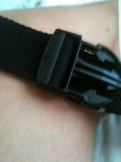 Fije la hebilla macho a la cinta de nylon. Deje que la correa restante colgar libremente por lo que se puede modificar el tamaño