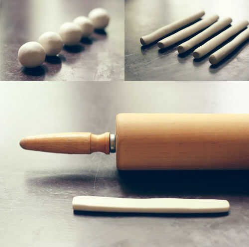 Rodillo cada bola de arcilla en una bobina de 5.5″ largo. Luego aplanar las bobinas a. 25″ gruesa con su rodillo.