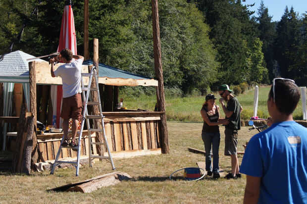 Empezamos a ser reforzar las piernas de las tiendas y perímetro de tierra borde externo con la madera rescatada. También ponemos un apoyo cruzado y un refuerzo de la "x" a la altura queríamos el contador de la porción a ser.