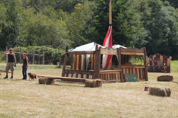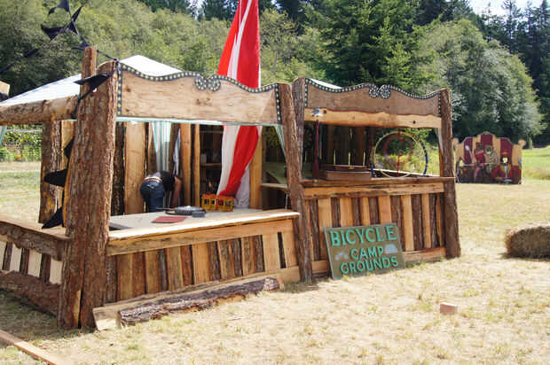 Utilizamos una sierra de calar para recortar la forma de nuestra fachada. Después hemos atornillado para arriba, hemos pintado una frontera decorativa circo alrededor de él. El cielo es el límite aquí y podría incorporar letras o luces si querías. Ahora realmente está empezando a parecer un circo rústico juego tanto!