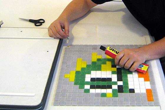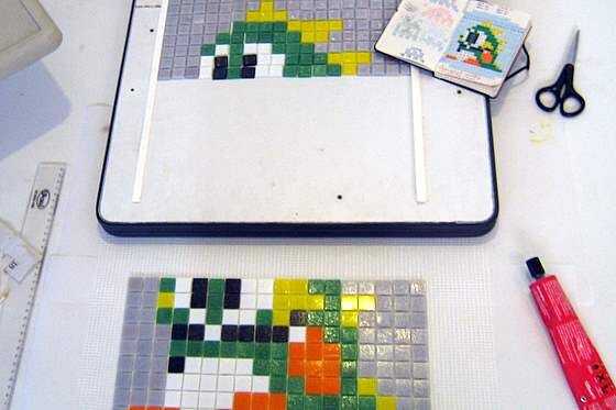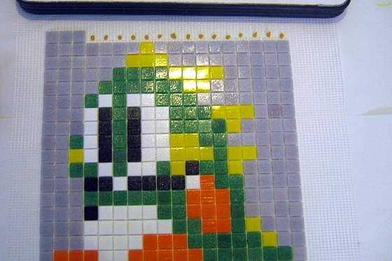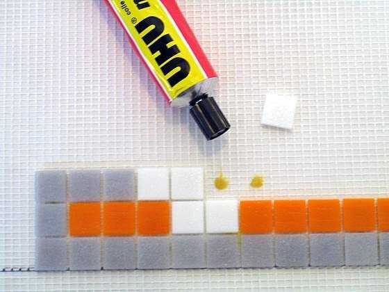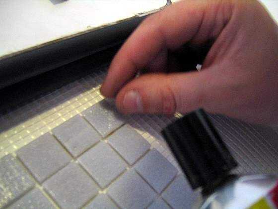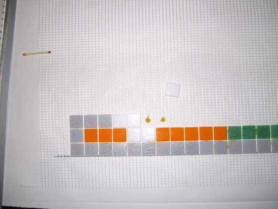 Suavemente Coloque sus fichas en la red, ayudándole con una regla y la cuadrícula neta dejó poco espacios regulares entre cada azulejo: es muy importante que el pegamento o cemento llenar este espacio cuando se coloca en una pared, o el mosaico que no será mas sólido y resistente.