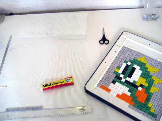3 - poner un poco de pegamento en una baldosa (el lado pelado) y colocarlo en la red, el pegamento del lado de la red.