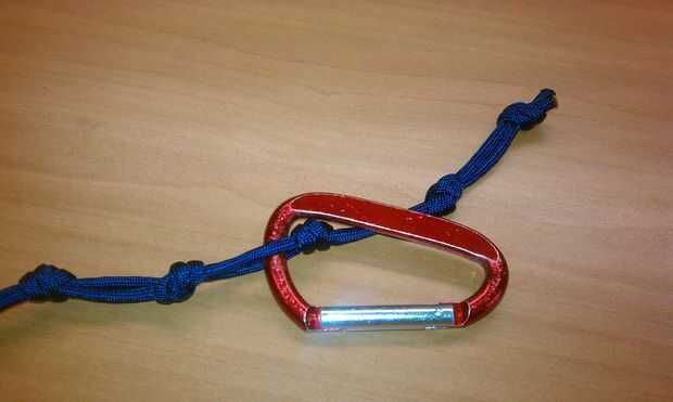 5. el siguiente paso será ir hacia abajo del extremo del cable y haga varios nudos, que ayudarán al asegurar la hamaca a correa. Dependiendo de la distancia entre sus dos árboles, puede ajustar la tensión hacia la siguiente área nudosa como se ve en la foto con carbiner.