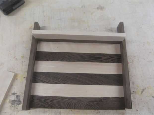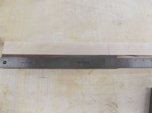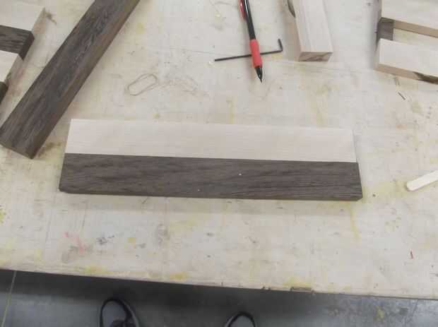 Comenzar por trazar cómo se reunirán los lados. Usé 2 tiras de madera en la espalda y uno en cada uno de los lados. Su elección de color puede variar, sino porque será grabado con láser la franja superior en la parte posterior, prefiero utilizar luz madera allí y oscurezca en los lados. Comenzar pegando la parte posterior dos tiras juntas. Cuando esté secando, plano abajo de los lados a 0,50 pulgadas de espesor. Espere a que la parte de atrás terminar el secado, luego plano hasta 0,50 pulgadas de espesor. Después de esto, tienes que cortar la parte de atrás hasta la anchura de la base, que es de 12 pulgadas. Termine con la espalda!