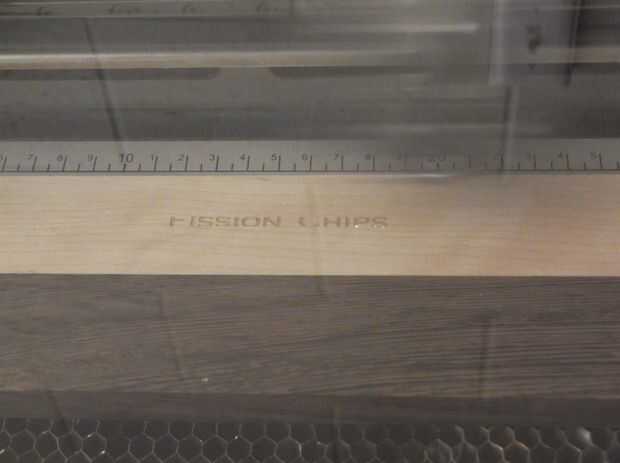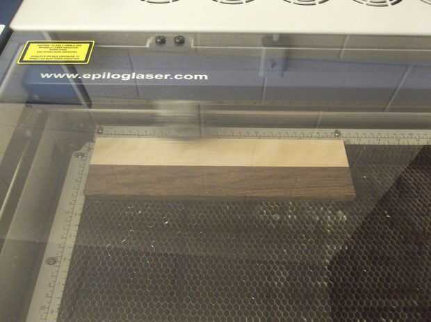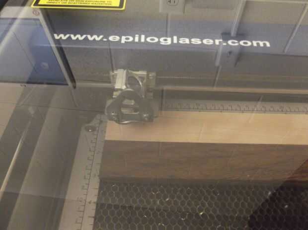 Ahora, le láser graba la parte posterior de la bandeja de entrada. Si no está familiarizado con el uso de un grabador del laser, Compruebe hacia fuera este Instructable. Centrado en el texto de mi nombre en la parte superior, pero puede variar. Usé un ajuste del 100% de potencia y velocidad. Esto debería funcionar para usted.