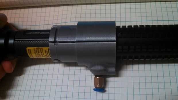Coloque las dos partes sobre el láser, tanto participar las aletas de la heatsync frontal y debe tener bastante bien! Si se sienten sueltas a usted, hay un collar de seguridad incluido en el archivo de impresión.
