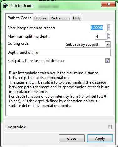 "Biarc interpolación tolerancia" y "División de profundidad máximo" ya no son relevantes, puesto que tenemos no hay arcos.