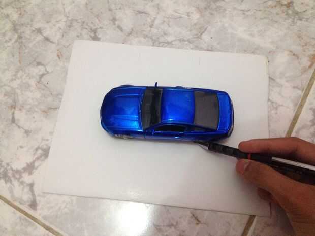 Seguimiento de las ruedas del coche a la cartulina. Luego se corta el patrón que hiciste. Asegúrese de que encajará a las ruedas del coche.
