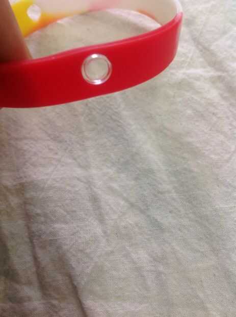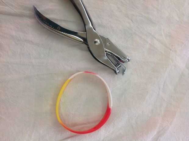 Primero hacer un agujero en la goma (o pulsera de goma) con un golpeador, o usted podría cortar un agujero con una aguja o algo puntiagudo, pero asegúrese de que el agujero no es mayor que la lente y sería aún mejor si el agujero es más pequeño que la lente.
