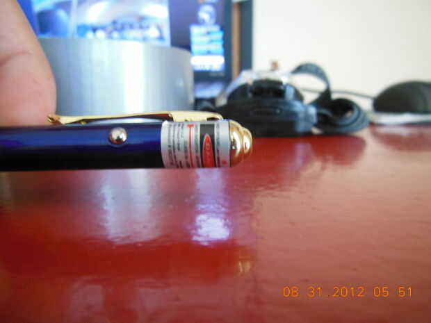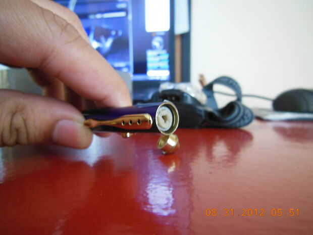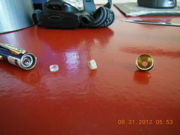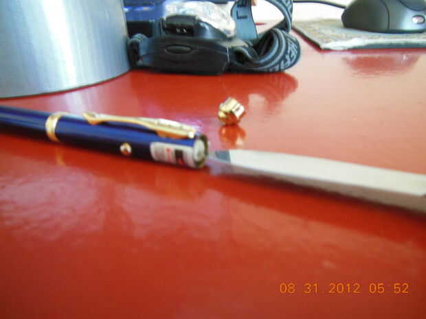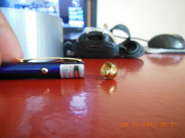 Así que lo primero que tienes que hacer es abrir el láser. Gire la parte superior, luego usando un cuchillo o destornillador quitar lo blanco. Tenga mucho cuidado al hacerlo porque hay un resorte que va a enviar la lente volando. Una vez que la lente fuera, haga una marca (con un tal vez de cuchillo) en el borde del lado que fue acentuado en hacia el láser. Esto es para saber la orientación correcta de la lente al poner en la cámara.