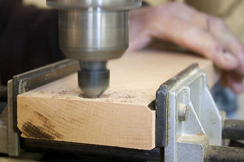 Encontrar el centro del lado corto y márquela 17mm al interior. Este será el punto central del agujero pequeño. Taladre un orificio de 10mm profundo. Utilizamos una broca de gran diámetro (19 mm, ver foto) para crear un agujero agradable y suave.