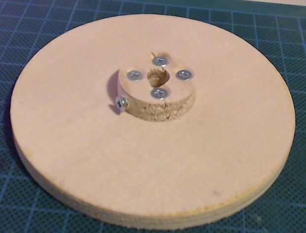 Usando mi gran agujero vio en una prensa del taladro, luego cortar cada uno de los discos de madera contrachapada.