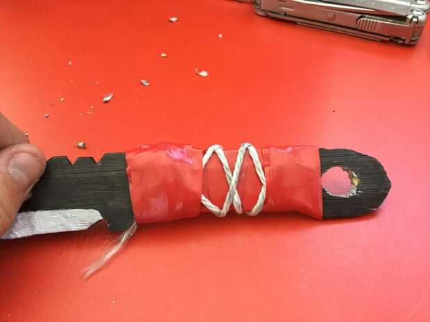 Para el mango envuelto 1 capa de cinta aislante alrededor de la manija, luego envuelto en un trozo pequeño de cuerda alrededor te manejar en un Criss cross forma. Luego agregué unas cuantas más capas de cinta a cada lado de la manija para mantener la cadena en su lugar.