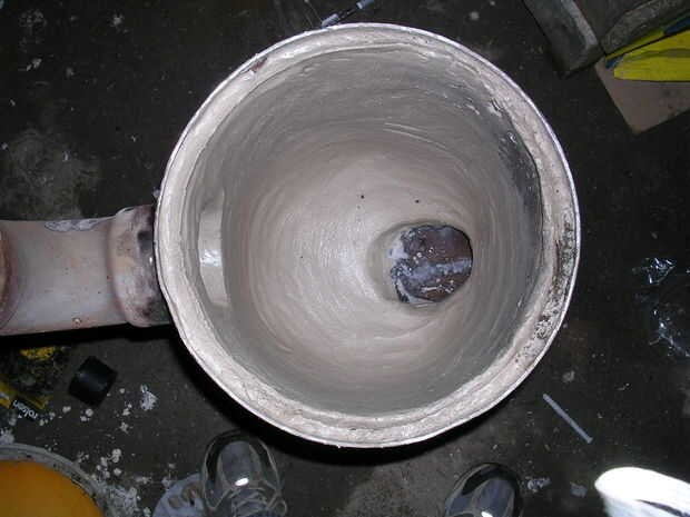 Luego forrado el interior del tanque con cemento de fuego a una profundidad de 3/4 - 1 "trabajando el cemento en el pozo y tratando de no cualquier bolsillos de ait en el cemento.