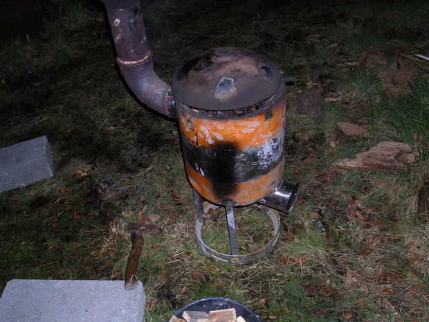 La estufa fue tomada hacia fuera de lado y el fuego fue encendido y permitió a acumular muy lentamente, después de unos 15 -20 mente empecé a construir el fuego con pequeños pedacitos de madera, el fuego se construyó lentamente durante las siguientes 2 horas, en este punto permitió el fuego morir hacia fuera y se quedó hasta que se enfríe