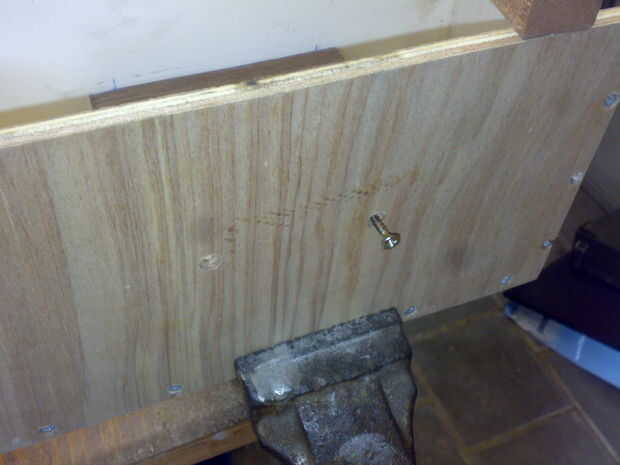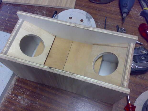 Después de la testfit y la perforación de los agujeros donde los altavoces tienen que caber en, empecé a pegar y atornillar el pequeñas piezas de madera en el interior para montar la placa que tienen en el medio.