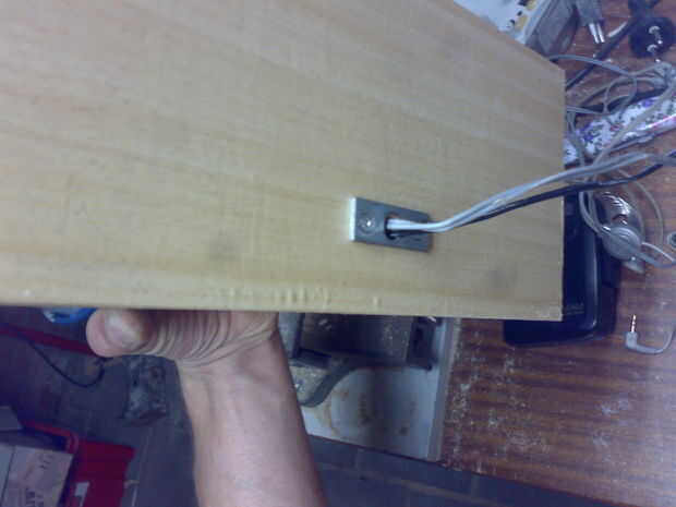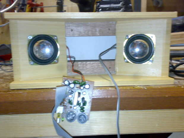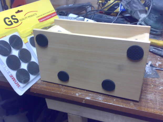 En la parte trasera que taladré un agujero para la entrada de 12 voltios y entrada de audio, bajo la caja he puesto unas pegatinas de goma para que no agite la caja sobre la mesa.