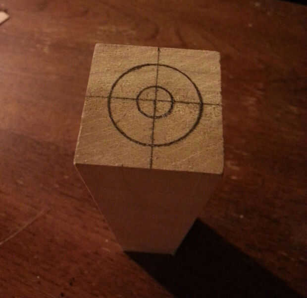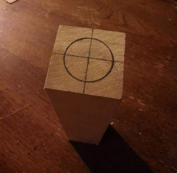 Utilice la plantilla de círculo para marcar un círculo de diámetro de 1 pulgada y un círculo de diámetro 3/8 de pulgada en el centro de la madera en ambos extremos. El círculo de 1 pulgada es el diámetro exterior de la boca y el cuerpo del señuelo y el círculo de 3/8 de pulgada es el diámetro exterior de la parte trasera del señuelo donde va estrechando hacia abajo.