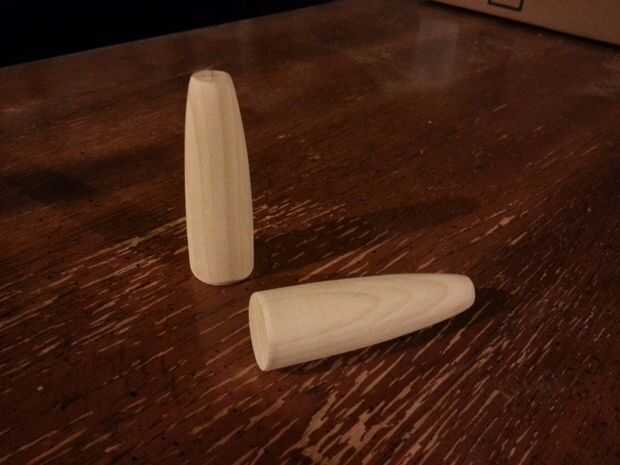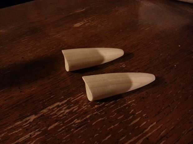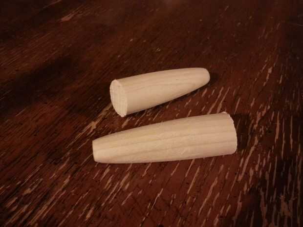 Tomar el pasador largo y cónico de 6 pulgadas y utiliza la Sierra de marquetería para cortar la espiga en la mitad para producir dos secciones de 3 pulgadas cónico. Estas secciones son los espacios en blanco del cuerpo bruto señuelos.